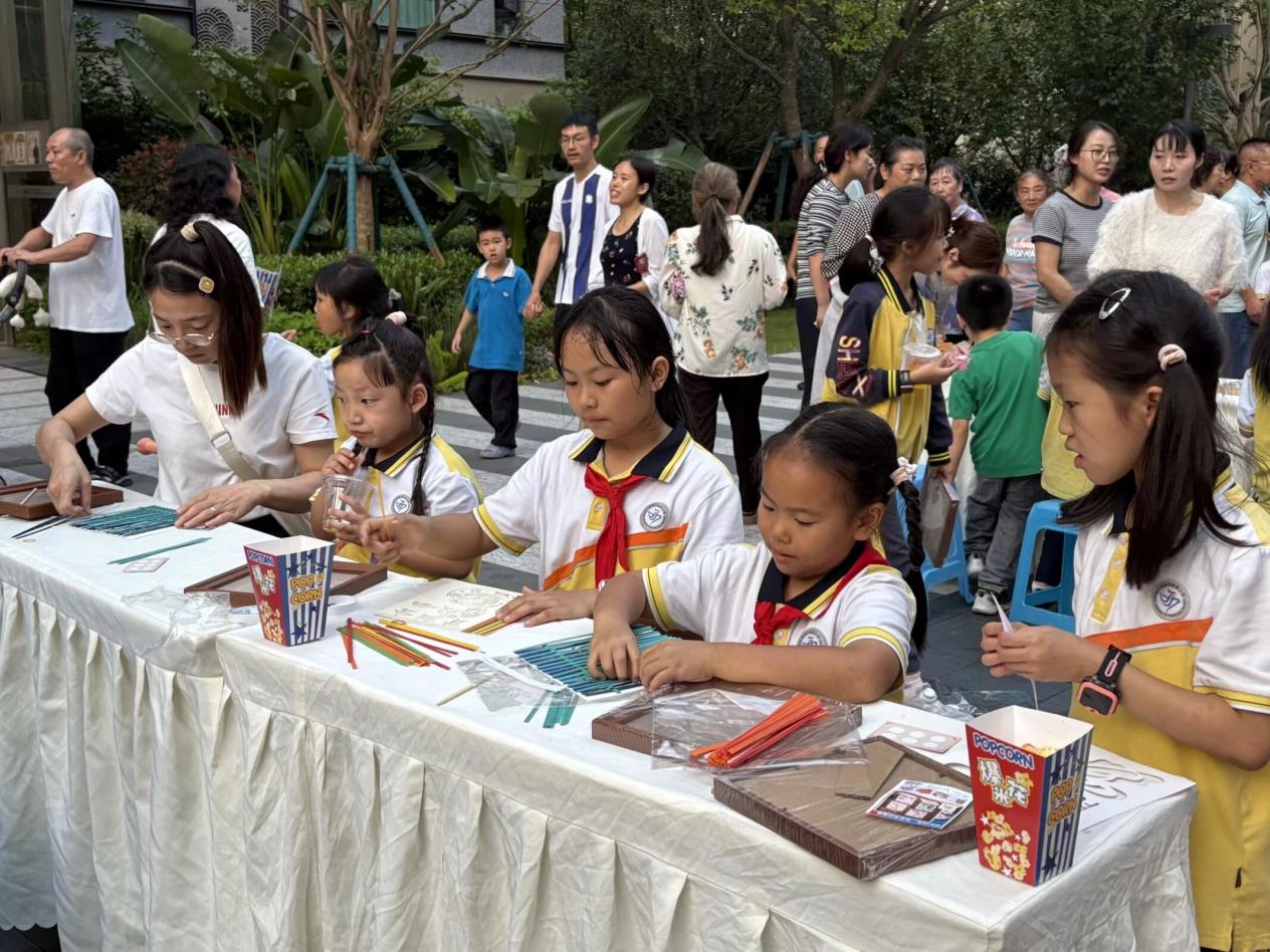 活动现场设置了民俗游戏互动区域和民俗藤编体验区。在游园区域,居民领取游园券参与猜灯谜、投壶游戏、快乐蹴鞠三项活动,以轻松有趣的形式点燃现场氛围,拉近邻里距离。现场布置了色彩缤纷的中秋灯谜,居民们或独自驻足灯笼下思索,或三五成群围坐讨论,遇到难解的谜题,还会主动向身边邻居请教。投壶游戏无论是年过六旬的老人,还是五六岁的孩子,都兴致勃勃地排队参与,在体验古人娱乐方式的过程中,收获轻松愉悦的心情。快乐蹴鞠环节则充满运动活力,参与者通过脚踢蹴鞠的方式,将球踢入球门得分,不仅让居民在适度运动中释放活力,更以轻松的方式让大家感受到节日的欢腾氛围。在“民俗藤编手工制作体验”区域,以传统工艺为载体,融合中秋、国庆文化内涵,吸引亲子家庭参与。社工向居民细致讲解藤条编织、缠绕固定、剪裁塑形等核心步骤,同时结合双节主题,解读作品元素的文化寓意--圆月、玉兔象征中秋团圆美满,五星、华表代表国庆的家国荣光,让居民在动手中领会“双节同庆”的意义。