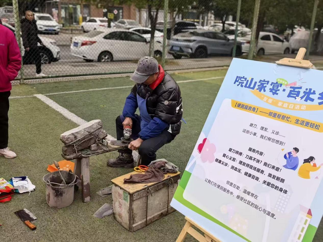 随后,五大互动区域同步开放,居民们在轻松温馨的氛围中自由参与,现场化身为一个功能复合、情感流动的“社区会客厅”:友邻美好生活集市汇聚便民服务,龙港医院医生为居民测量血压、血糖,爱心师傅提供磨刀、理发,将关怀落实到日常生活细节中;